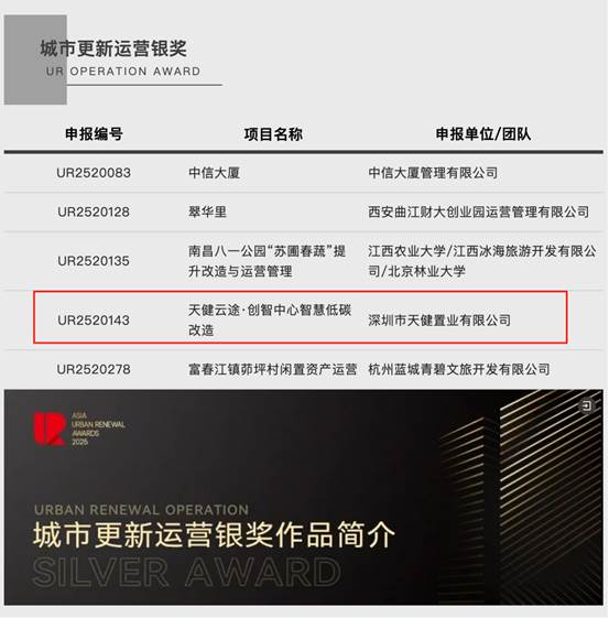 近日,2025年度AURA亞洲城市更新獎正式揭曉,由天健置業公司運營的天健云途·創智中心智慧低碳改造項目,斬獲城市更新運營銀獎。